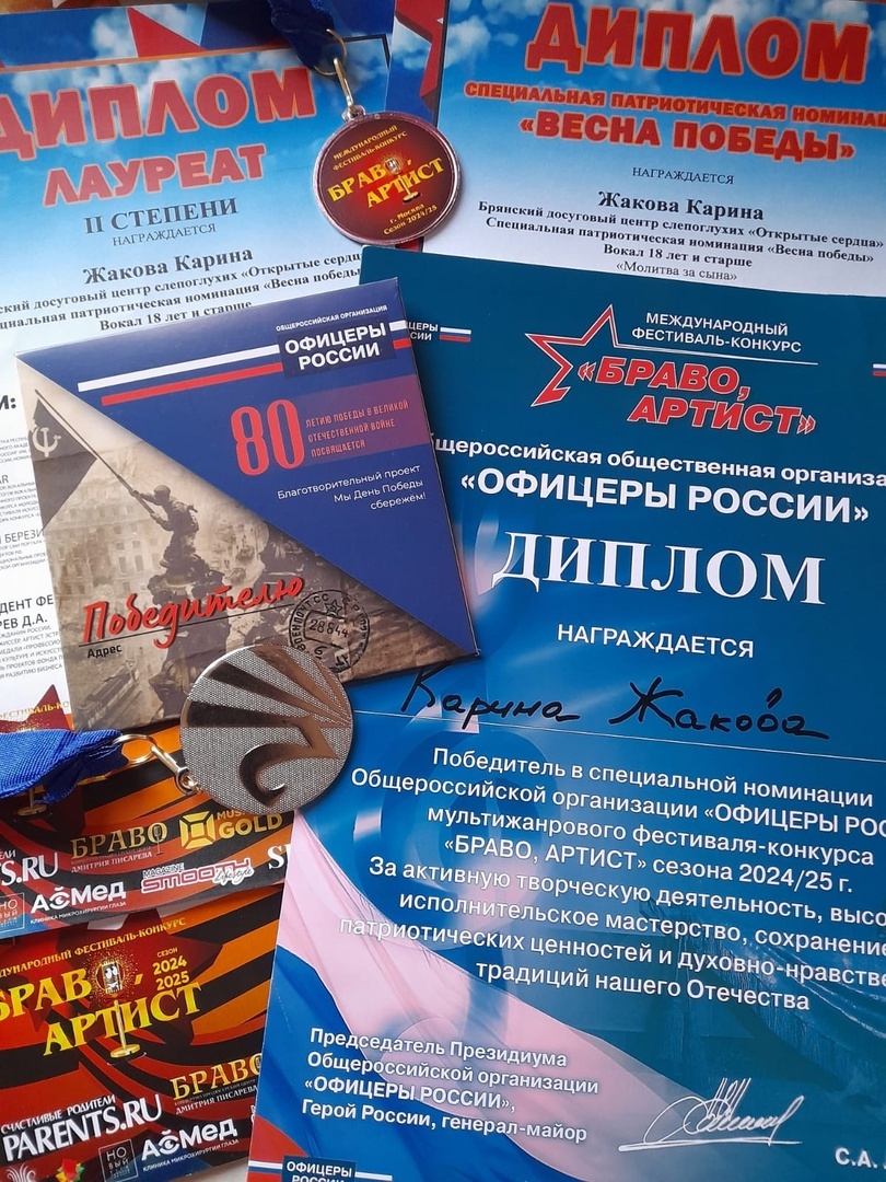 По решению компетентного жюри Карина получила звание Лауреата ll степени в Специальной патриотической номинации "Весна Победы" и диплом Победителя от Российской общественной организации " Офицеры России" с песней "Молитва за сына".