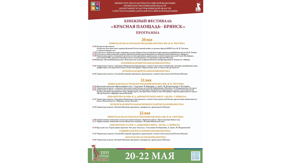 20–22 мая пройдет традиционный книжный фестиваль «Красная площадь–Брянск». Его проводит областная научная библиотека имени Тютчева. На площадках Брянска и области можно будет пообщаться с писателями, послушать выступления поэтов, принять участие в дискуссиях. Состоится открытие выставки книг, изданных в годы Великой Отечественной войны, из редкого фонда библиотеки. На фестивале подведут итоги выставки-конкурса «Брянская книга 2024–2025» и объявят лауреатов. Предусмотрены мероприятия для взрослой и детской аудиторий. Вход свободный. Возрастное ограничение 6+ Традиционный книжный фестиваль «Красная площадь–Брянск» пройдет 20-22 мая