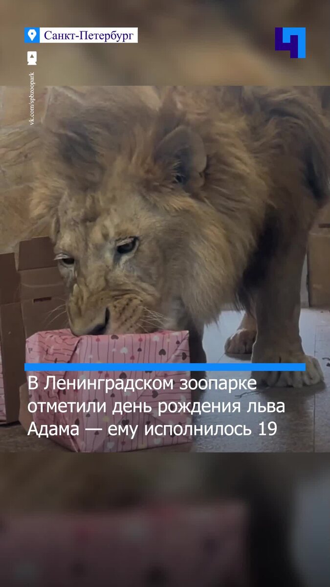 В Ленинградском зоопарке 10 мая отпраздновали день рождения льва Адама — ему исполнилось 19 лет. Для хищника это солидный возраст. В честь события сотрудники устроили праздничное угощение: тушки курицы спрятали в коробки, обёрнутые бумагой с портретом льва. Адам с интересом разорвал упаковку и с удовольствием съел угощение. Не осталась без внимания и его спутница — львица Таисия тоже получила лакомство. "Нашему царю зверей, льву Адаму, исполнилось 19 лет. Это солидный возраст для такого могучего и величественного кота. В честь грандиозного события киперы устроили праздничное угощение для именинника и его спутницы, львицы Таисии", — поделились в Ленинградском зоопарке.