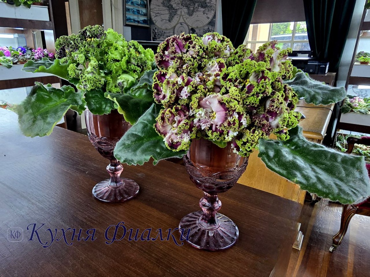 Наши фиалки: ЕК-Модная Красотка и ЛФ-Авокадо КФ такие близкие по духу друг другу сорта. Плотные жёсткие очень крупные цветы-кочанчики с невероятно долгим и впечатляющим цветением.
