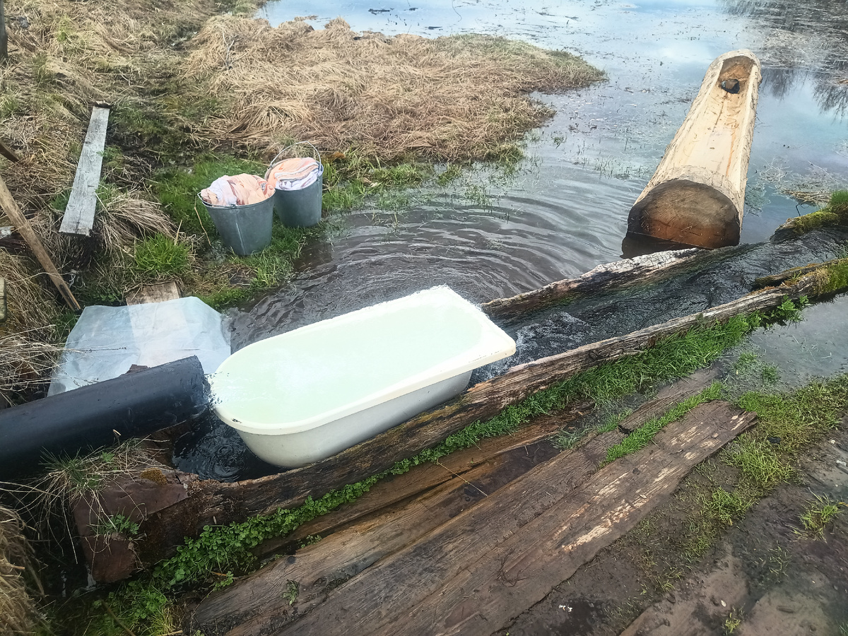 По планам вчера было постираться последний раз в старой родниковой колоде и сегодня ставить новую. И я этого плана придерживался!) Сначала я содрал с места старую колоду, по воде её убрал в сторону и далее начал углублять место под новую колоду, так как новая колода у нас получилась выше старой! Земля состояла из песка, гальки и булыжников. Копать было сложно! Иногда давал мути осесть, чтобы видеть где и как копать! Походу работы я неоднократно подводил колоду на место и выяснял где ещё нужно копать, чтобы она встала так, как следует. Так чтобы конец у трубы был выше, чем конец где сливное отверстие. А также, так чтобы мне попробовать колоду поставить на камни, чтобы она не гнила от земли! После нескольких примерок, новая родниковая колода встала удовлетворительно. Я её зафиксировал по краям камнями и внутрь положил крупные камни, чтобы водой её не приподняло, если вода ещё прибудет! В целом новая колода смотрится лучше, чем старая!) Теперь, если вода больше не прибудет и не сорвёт кол