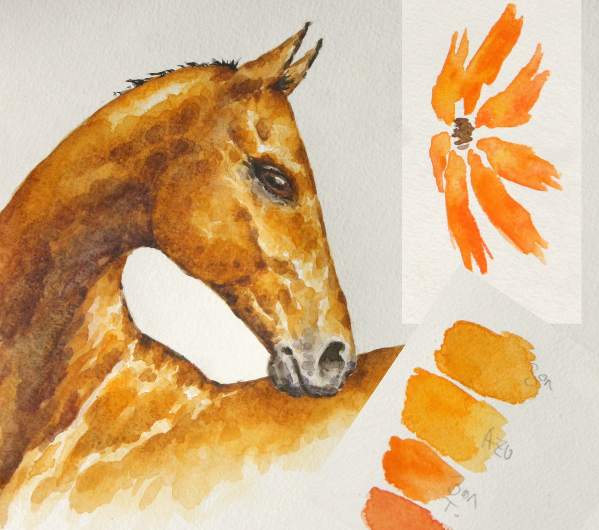 Итак, время шло, буланые кони на бумаге плодились, да и закаты на старом торшоне пламенели не только приторностью кадмиев, но и сдержанным золотистым сиянием, и всё было прекрасно, пока в один прекрасный день не закончилась очередная кюветка краски. Что-то давно я не пополняла запасы... Краска под названием «Золотистая» (ленинградская, как обычно) была куплена, распакована... И тут меня ждало полное разочарование. Это был совсем не тот цвет! Какой-то цветочный желто-оранжевый замес настурциевого оттенка... Наверное, бракованная попалась. Но и следующая кюветка оказалась такой же. Потом я обнаружила краску под названием «Золотистая темная» – наверное, вот оно, то самое! Но нет, различия с новой «Золотистой» были минимальными. Всё тот же цветочный оттенок. В общем, беда!.. Как же я без своей «Золотистой»...
