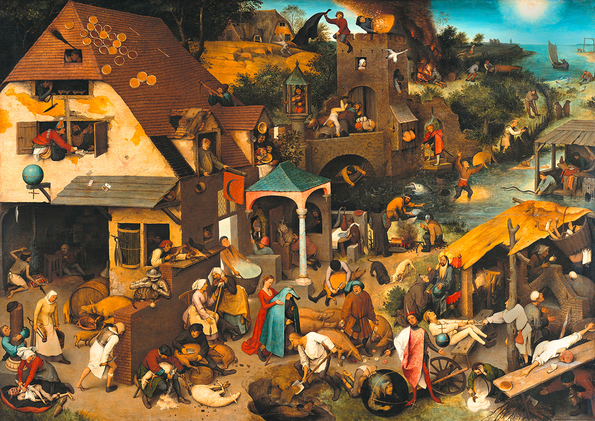 Перед нами удивительная картина Питера Брейгеля Старшего — «Фламандские пословицы». Об этой картине кто только не писал. Во многих статьях по сюжету этой картины по полочкам разложены фрагменты и пословицы к ним. И становится всё понятно. Это не просто изображение деревни, а целый мир, и, причём странный, где каждый житель — воплощение народной мудрости. Посмотрите внимательно, можно увидеть, как обычные сценки из жизни превращаются в яркие образы пословиц и поговорок. Перед нами фламандская (кстати, где же эта «Фламандия»?) деревня на берегу моря. Что же делают её жители? Вы видите круги на крыше (это пироги). Под крышей одного из домов расположились парочка и метла. Как пишут исследователи, здесь речь идет про выражение «Выйти замуж под метлой», которое означает сожительство, жизнь без вступления в официальный брак. Что перетягивают два человека почти в центре картины, что делают с головой в окне, под которой какая-то тарелка (ножом бреют щёки без мыла). Эти странные люди – г