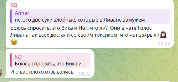 Я много раз писала, так или иначе, о том, что в Ливане "русскоязычная община" не без червоточины. Есть те, кто, к примеру, ждет прихода израильских танков, дабы страну для этих теток от ненавистных шиитов, суннитов, палестинцев и сирийцев очистили. Те, кто активно ставил лайки сообщениям о нападении на очередную машину с участниками Движения Сопротивления. Ненавидят сирийцев и радовались падению законной власти в этой стране...