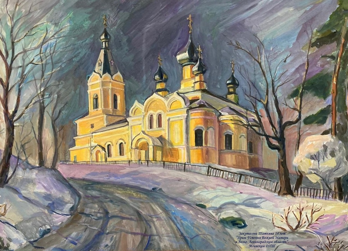 В рабочем посёлке Мга Ленинградской области есть детская художественная школа – и один из преподавателей этой школы, Н.А. Мельникова, отправила на конкурс «Герои живут в моём сердце» в номинацию «Краски любимой России» работу своей ученицы, четырнадцатилетней Татьяны Закутасовой. Она называется «Храм Успения Божией Матери в Лезье». Вот такие талантливые дети живут в нашей стране – низкий поклон их замечательным педагогам!