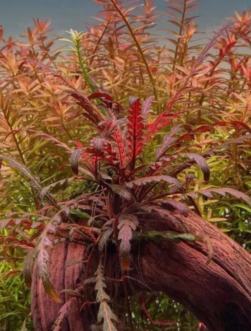 ## Гигрофила Пиннатифида: уникальное аквариумное растение ### Описание растения **Гигрофила Пиннатифида** (Перистонадрезанная) представляет собой удивительное длинностебельное растение, сочетающее в себе свойства папоротников и почвопокровных видов. ### Особенности роста Растение обладает уникальными характеристиками: * Способность прирастать корнями к камням и корягам * Активное стекание по грунту с укоренением каждого междоузлия * Формирование прямых вертикальных стеблей из каждой укоренившейся мутовки * Возможность повторного наклона стеблей к грунту ### Внешний вид **Листовая часть**: * Длинные (до 15 см) выемчатые листья * Лицевая сторона: окраска от темно-зеленой до коричневой * Тыльная сторона: характерная розовая окраска * Толстый, плотный, почти одеревенелый стебель ### Условия содержания **Основные требования**: * Длинные междоузлия (5-10 см) требуют формирующей обрезки * Оптимальный pH: 6-7 (желательна подача CO2) * Обязательное внесение калия для предотвращения появле