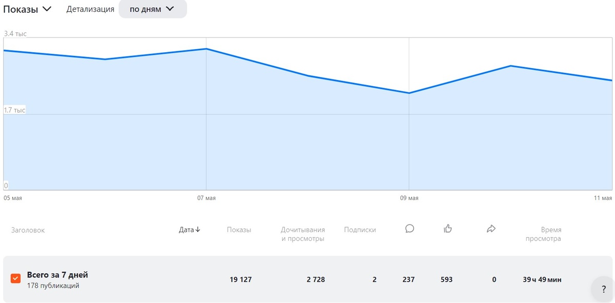Мне кажется, эта неделя вышла хуже предыдущей по всем показателям. Но надо это проверить. А для этого придется погрузиться "в сладостный мир цифр", как говорил герой моего любимого фильма "Служебный роман". Я бы не возражала, если бы эти числа были в разы больше, но других у меня для вас нет. Поэтому смотрим то, что есть. Показы. Интересно, что на прошлой неделе показы выдавали для 232 статей, а на этой неделе всего лишь для 178 статей. Вот график за прошлую неделю. А вот полный отчет за прошлую неделю: Но количество выданных показов на прошлой неделе (19127) все же больше, чем на позапрошлой (16331), хоть и на меньшее количество публикаций. Даже не знаю, стоит ли считать количество показов на публикацию при таком количестве материалов, которые обошли вниманием, то есть показами вовсе! Посмотрю количество дочитываний и просмотров: Просмотров (2728) чуть больше, чем на позапрошлой неделе (2601). А вот времени на это читатели потратили меньше, чем неделей ранее - 39 часов 49 мин
