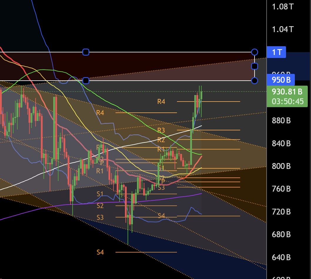 🤡 #MrMozart 📢 Оригинальный пост 🤡 TOTAL3 подходит к нижней границе целевого диапазона частичной фиксации альт-портфеля (950 - 1 трлн$). 🤡 Ожидается дальнейший рост, первая глобальная цель — 1 трлн$. 🤡 Если следующая неделя закроется выше 955 млрд $, второй глобальной целью станет 1.15 трлн$. 🤡 Не следует ожидать безоткатного роста, это лишь первая волна.