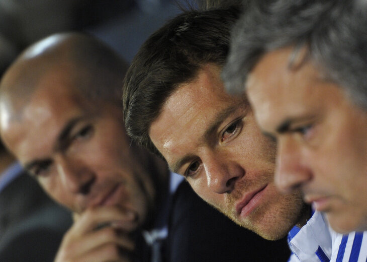 Пропитано величием. Кадр, который теперь значит гораздо больше: два бывших и один будущий тренер «Реала». Зинедин Зидан с Жозе Моуринью по краям, Хаби Алонсо в центре. Кадр сделан 12 апреля 2011-го, «Мадрид» играл выездной четвертьфинал Лиги чемпионов против «Тоттенхэма». В сезоне-2010/11 Моуринью попросил Зидана приходить с ним на пресс-конференции перед играми плей-офф ЛЧ. По протоколу с тренером должен быть еще и футболист – перед лондонским матчем Жозе выбрал Алонсо. Так и получилось это фото. Оно за 14 лет просто прекрасно состарилось. Зидан тогда работал одним из директоров «Реала», а Хаби Алонсо проводил второй сезон в команде и уже был ключевым полузащитником. Сезон завершился для «Реала» победой в Кубке Испании, вторым местом в чемпионате и вылетом в полуфинале ЛЧ от «Барселоны» – «Тоттенхэм» прошли благодаря 5:0 по сумме двух матчей, в Лондоне победили 1:0. Полуфинал звучит не космически для «Реала», но тогда это было достижением: первый выход с 2003-го. Зинедин через два год