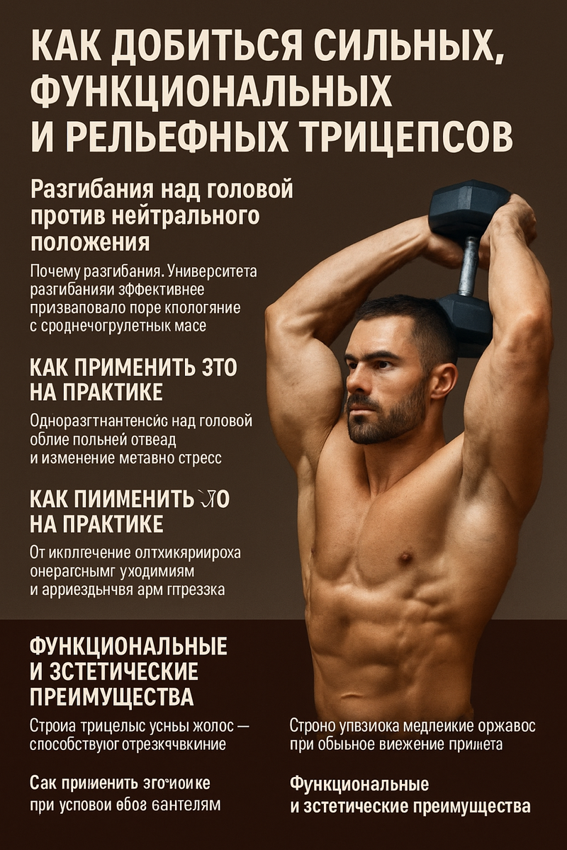 Как внедрить эти знания в свою тренировочную программу? Начните с включения разгибаний над головой с гантелями или на блочном тренажёре. Следите за правильной техникой: держите локти рядом с головой, полностью выпрямляйте руки и медленно опускайте вес, контролируя движение для максимального вовлечения мышц.