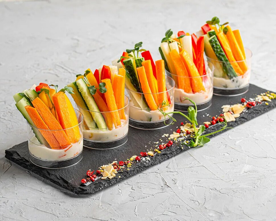 **Овощные канапе с хумусом** Для начала вам понадобятся следующие ингредиенты: свежие овощи (помидоры, огурцы, сладкий перец), хумус и любимые хлебцы или мини-булочки. Хумус можно купить в магазине, но, если у вас есть немного времени, приготовьте его сами. Просто смешайте в блендере консервированный нут, тахини, чеснок, лимонный сок и оливковое масло. Получится вкусная, насыщенная паста.