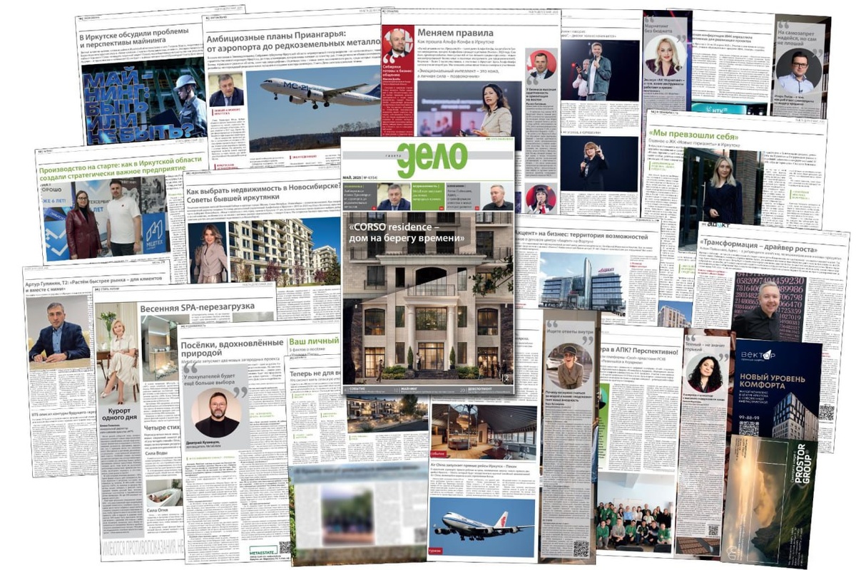 Вышла в свет Газета Дело за май 2025 года Главная тема номера – успешные проекты иркутского бизнеса в разных сферах экономики: строительстве, девелопменте, медицине, digital, wellness-индустрии, производстве продуктов, ретейле. Также в этом выпуске известные российские эксперты делятся своим бизнес-опытом и полезными инструментами для предпринимателей. Кроме этого, в майском номере представлены планы регионального правительства на развитие региона и мнение власти, энергетиков и майнеров по такой проблеме, как запрет в Иркутской области майнинговой деятельности.