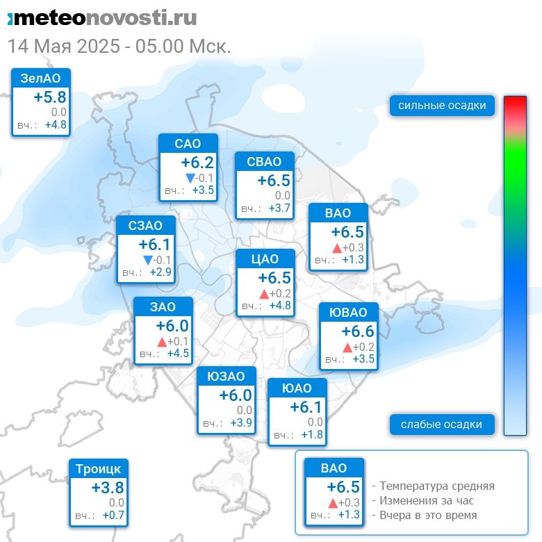 В 5:00 в Москве было от +5.1°C до +6.9°C, средняя температура +6.2°C #погода #Москва #весна #температура #14мая #среда Перейти на сайт Прогноз погоды на 14 дней