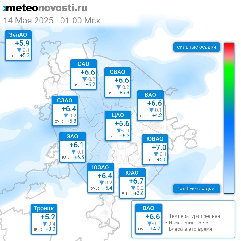 В 1:00 в Москве было от +5.2°C до +7.1°C, средняя температура +6.5°C #погода #Москва #весна #температура #14мая #среда