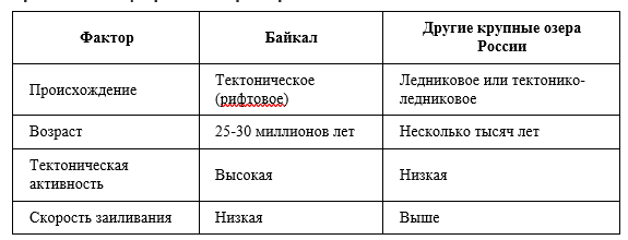 Большинство других крупных озер России (например, Ладожское, Онежское, Чудское) имеют ледниковое или тектонико-ледниковое происхождение. Они образовались в результате деятельности ледников, которые вырыли неглубокие котловины. Возраст этих озер значительно меньше, чем у Байкала (обычно несколько тысяч лет), и они не расположены в зонах активного тектонического разлома. Это и объясняет их значительно меньшую глубину.