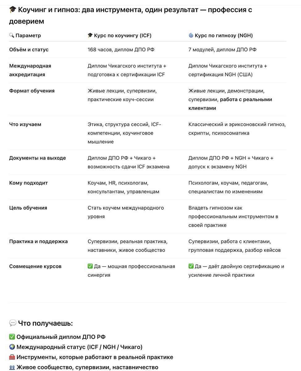 В ответ на пост 🌀 Ты можешь прочитать 100 книг - и не сдвинуться с места. А можешь пройти курс, где каждый модуль - шаг в профессию, где тебе доверяют клиенты, платят за результат и рекомендуют дальше. 📍 Мы собрали два курса — по коучингу и по гипнозу — которые дают не просто знания, а настоящую опору для практики. Они разные. Но у каждого — своя сила. И ты можешь выбрать один. Или соединить оба. 📊 Вот таблица отличий, чтобы тебе было проще понять, чем именно они различаются - и какой подойдёт именно тебе: (👆см. выше - таблица прикреплена) 🎓 Оба курса: ✔️ Дают диплом ДПО ✔️ Признаны международными организациями (ICF / NGH) ✔️ Построены на практике, супервизии и живом сопровождении ✔️ Подойдут тем, кто хочет не «послушать», а работать с людьми