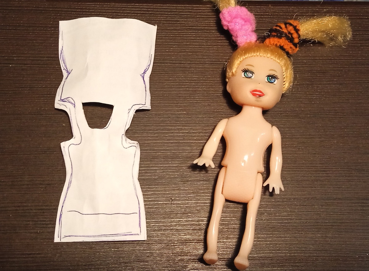 Всем привет. В этом материале расскажу, как легко и быстро сшить из экокожи простой сарафанчик для маленькой куколки размером 10 сантиметров. Укорачивали брюки, осталось четыре полоски тонкой экокожи приятного цвета "пыльная роза" - решили использовать частично таким образом. Для начала, как обычно, рисуем на бумаге и вырезаем примерную выкройку. Далее переносим её на экокожу - делаем это с лицевой стороны при помощи гелевой ручки металлик, след которой хорошо виден и легко стирается. Вырезаем. Занятие несложное, справится даже ребёнок. Пусть не совсем ровно получается, зато совместное творчество сближает. Выворачиваем на изнаночную сторону и начинаем сшивать детали. Мы сначала выполнили боковой шов. Может, логичнее было бы сначала подогнуть и подшить проймы, но у нас вышло так: один боковой шов, пройма, вырез горловины, другая пройма, второй боковой шов. Для скорости, чтобы реже обрывать и закреплять нить. В конце подогнули и подшили нижний край сарафанчика. Вот такой простой кожаный