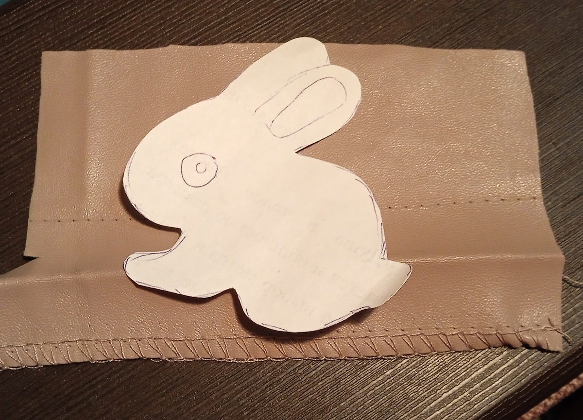 Всем привет! Сегодня из тех же кусочков экокожи, оставшихся после укорачивания брюк, мы сошьём симпатичный брелок в виде маленького зайчика. Для начала, как обычно, делаем на бумаге выкройку и вырезаем её. Обводим выкройку дважды (как есть и в зеркальном отражении) на лицевой стороне экокожи при помощи серебристой гелевой ручки-металлик. Цвет "пыльная роза" для зайчика подходящий. Вырезаем детали по контуру. Для начала оформляем ушки, добавляем элементы розового цвета. Также пришиваем небольшие чёрные бусинки-глазки. Начинаем сшивать детали. Так как в качестве материала у нас обрезки от брюк, есть посторонние строчки; если брать новую экокожу, поделка получится аккуратнее. В процессе сшивания постепенно наполняем зайку холлофайбером или т. п. Попутно вышиваем розовый носик. Симпатичный зайчишка получается! Сшить детали совсем несложно. В конце вшиваем подвеску, чтобы можно было использовать фигурку в качестве брелока. Можно оставить без неё, тогда будет просто игрушка. А вот и готовый