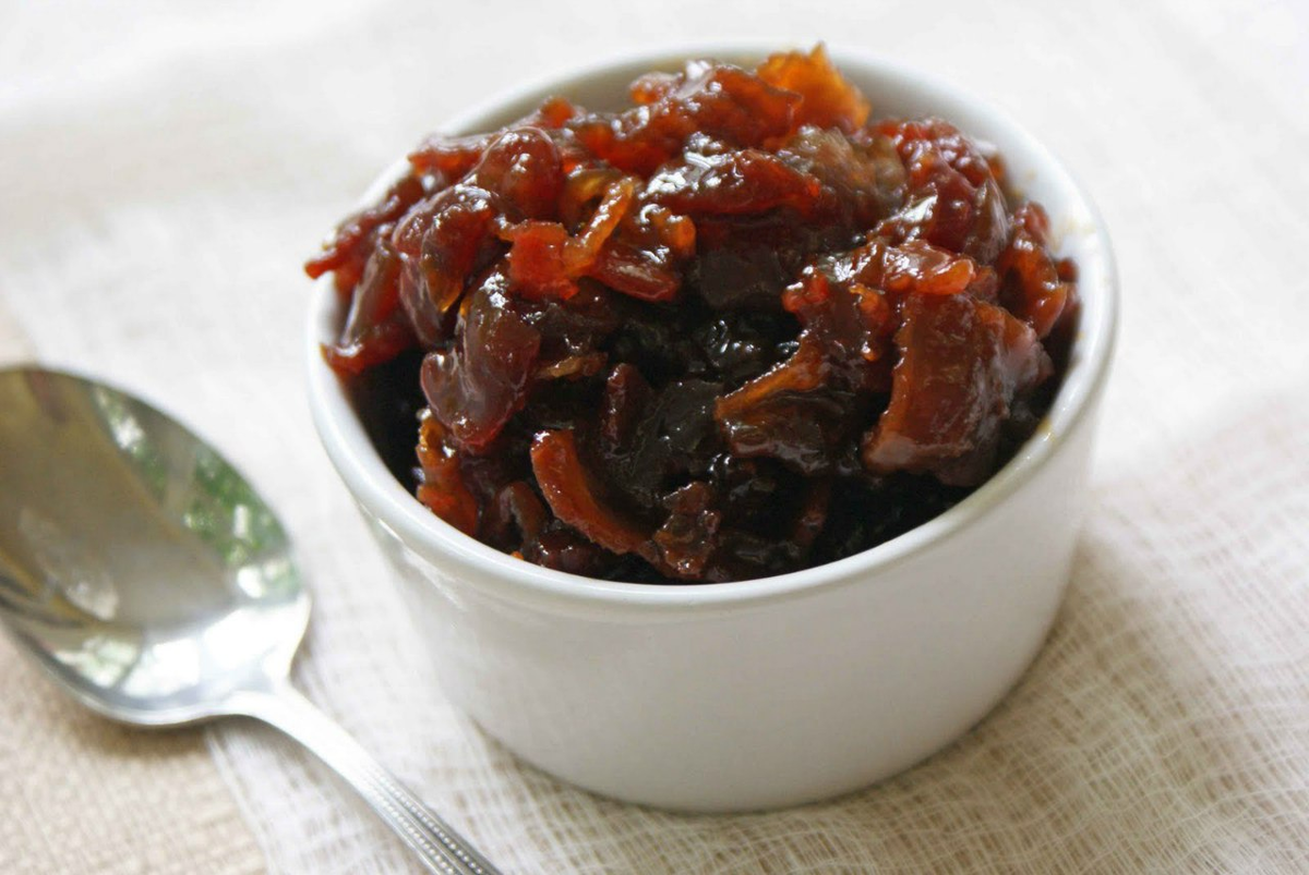■ Верните бекон на сковороду к луку, добавьте коричневый сахар, кофе, кленовый сироп, уксус и горчицу. Тушите на среднем огне в течение получаса до консистенции джема.