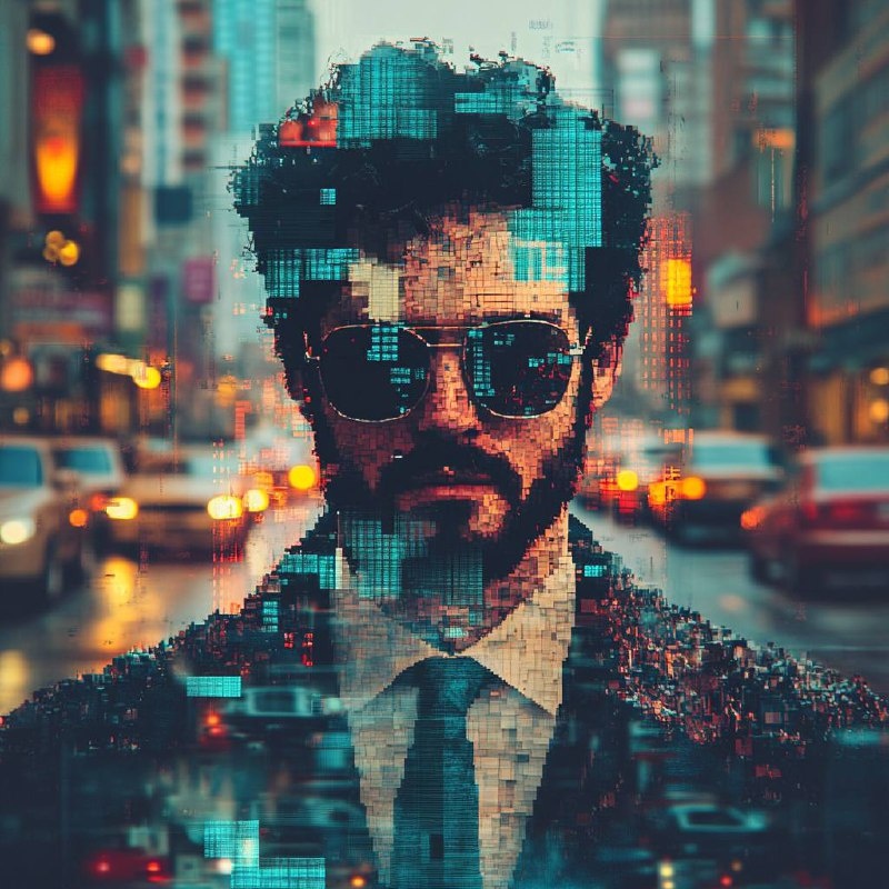 😏🤲👍 Эффект пикселизации A pixelated portrait of an urban man with retro sunglasses, wearing a jacket and tie, with a busy street with cars in the background. The face has multiple small pixels arranged to form facial features, and his hair appears as if it's made up from colorful blocks. In front of him, there's a digital glitch effect that adds depth and texture to the scene. Если понравилось, ставьте 👍 #midjourney #flux #dalle #gpt #midjo #art #midjoart #luma #hailuo #minmax #kling #video #ai #faceswap 🤖 Попробуйте сами с Midjourney Bot
