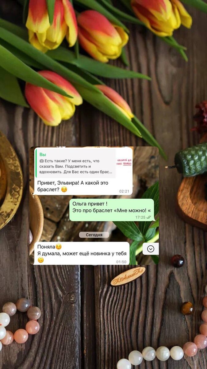 Сохраните мой контакт @kamelika_magelvira И Вы будете видеть мои личные сторис. Утренний диалог с Ольгой. Одной из наших Волшебных девочек, у которой уже очень много моих браслетов. Может браслет «Амритам» для нее тоже станет браслетом номер 1 и она захочет вернуться к практикам в наше сообщество «МыДвижение».