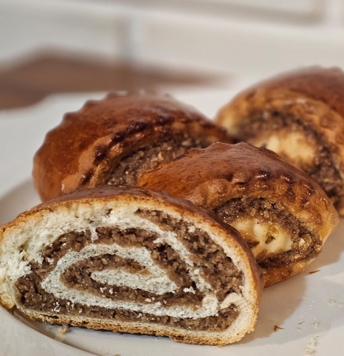 Ореховые рулетики👍 Грецкие орехи 130г сахар 90г цедра лимона 1ч. л. Изюм крупный,мясистый 50 гр. Яйцо для смазки Начинка: Орехи помыть, просушить, обжарить, добавить сахар, цедру лимона и крупный изюм, измельчить в чаше блендера. В миску выливаем 125 мл тёплого молока, высыпаем 1 ч.л. сухих дрожжей, 40 г сахара и 1 ч.л. ванильного сахара. Перемешиваем венчиком, накрываем полотенцем. Даём постоять 10-15 минут. Затем добавляем сюда ½ ч.л. соли, 1 яйцо и выливаем 50 г растопленного и полностью остывшего сливочного масла. Тщательно перемешиваем всё венчиком и начинаем в тесто вводить муку - 350 г просеянной муки. Миску смазываем маслом, кладём тесто и накрываем тонким полотенцем. Даём подойти в течение часа, тесто должно увеличиться в 2-3 раза. Тесто подошло (прошёл час) Раскатываем тесто в прямоугольник толщиной чуть больше половины сантиметра. Тонко не раскатываем начинка не должна потечь. Теперь на раскатанное тесто выкладываем ореховую начинку и распределяем её равноме