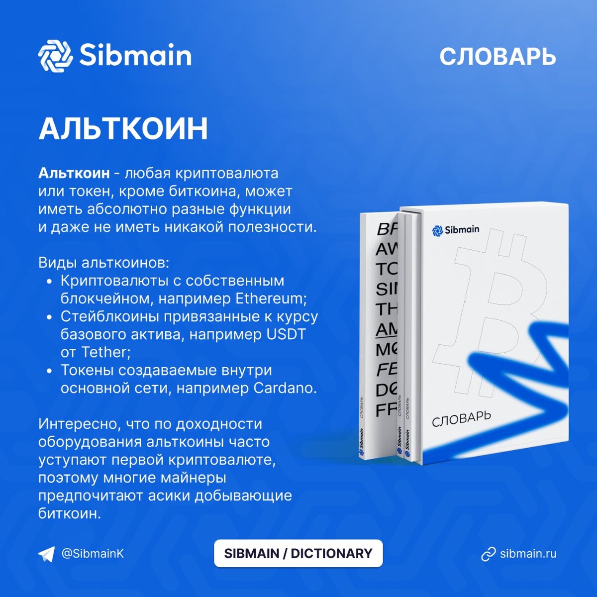 📕📕📕📕 Альткоин Альткоин - любая криптовалюта или токен, кроме биткоина, может иметь абсолютно разные функции и даже не иметь никакой полезности. Виды альткоинов: ✅Криптовалюты с собственным блокчейном, например Ethereum; ✅Cтейблкоины привязанные к курсу базового актива, например USDT от Tether; ✅Токены создаваемые внутри основной сети, например Cardano. Интересно, что по доходности оборудования альткоины часто уступают первой криптовалюте, поэтому многие майнеры предпочитают асики добывающие биткоин. Sibmain комплексные решения для майнинга под ключ! - Поставки майнинг оборудования - Дата-центр в Красноярске 80 МВт - Размещение от 5 руб/кВтч ⌨️ Нужна консультация или помощь в подборе оборудования? Звоните: +7(800)351-14-70 📍 г. Москва Калужская площадь д.1 к.1 💬 WhatsApp 💬 @Sibmain_salesbot 🌐 sibmain.ru