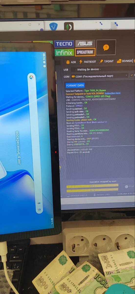 Teclast M50 TLA007 Циклическая перезагрузка Отключить шлейф акб и по новой подключить, в программе UnlockTool выбираем вкладку spreadtrum - brand sped generic - tiger t606_64 bypass - format data - на планшете зажимаем громкость вниз и подключаем пк. Получаем результат 😊