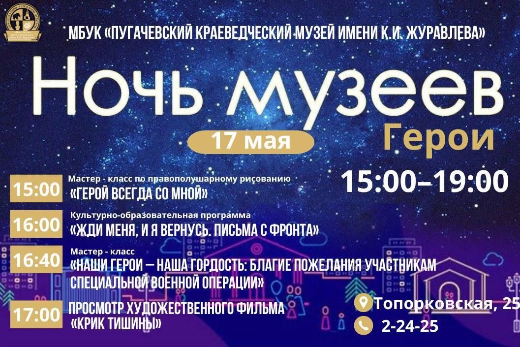 🌌 Ночь музеев в краеведческом музее имени К.И. Журавлева и мемориальном Доме-музее В.И. Чапаева. 17 мая приглашаем жителей и гостей Пугачева на ежегодную акцию «Ночь музеев». В Год защитника Отечества она посвящена теме «Герои».