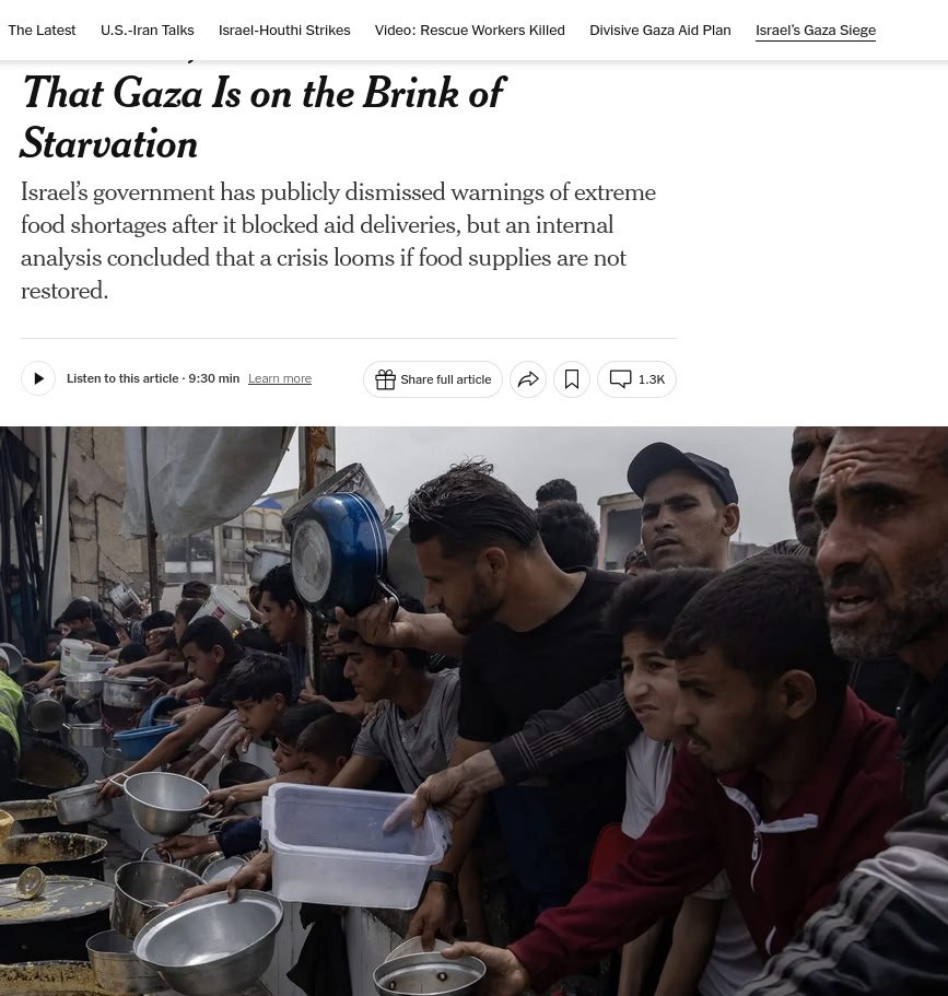 До этого Тель-Авив на протяжении нескольких месяцев опровергал возможность наступления голода, представляющего серьезную угрозу жизни мирного населения. Теперь же израильские офицеры, ответственные за анализ гуманитарной ситуации в Газе, предупредили своих командиров о нехватке продовольствия для удовлетворения даже самых минимальных потребностей в питании, — пишет The New York Times.