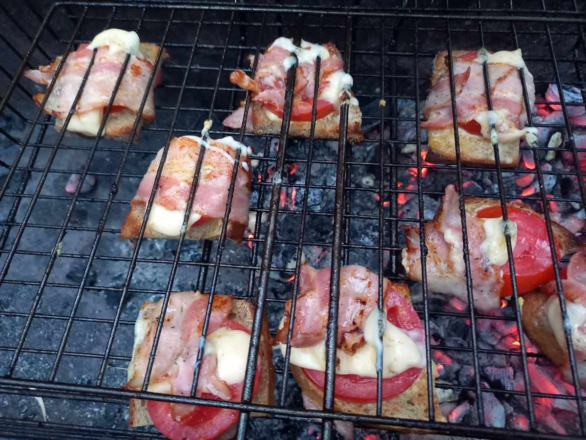 Всем привет! Сегодня на моем канале будет рецепт бутербродов, которые готовятся на мангале. Обычно после того, как приготовили шашлык остаются еще достаточно хорошие угли, которые прогорают в пустую. Вот такие угли идеальны для приготовления бутербродов на решетке. В данных бутербродах вкусовое сочетание ингредиентов, я считаю без проигрышное. Хлеб и бекон получаются хрустящие, помидор очень сочный, а сыр тягучий. Готовить не сложно и быстро. Дети "смели" эти бутерброды за две минуты, взрослым практически не досталось. Способ приготовления: Хлеб,помидоры, сыр нарезаем ломтиками. Ломтики должны быть толщиной от 0,5мм. Больше можно, меньше нет, т.к. ингредиенты подгорят. Бекон вытаскиваем из упаковки. Каждый кусочек хлеба смазываем тонким слоем майонеза. Затем на хлеб по верх майонеза выкладываем ломтик помидора. На помидоры раскладываем ломтики сыра Каждый бутерброд оборачиваем полоской бекона. Выкладываем бутерброды на решетку. Решетку закрываем. Устанавливаем решетку на мангал
