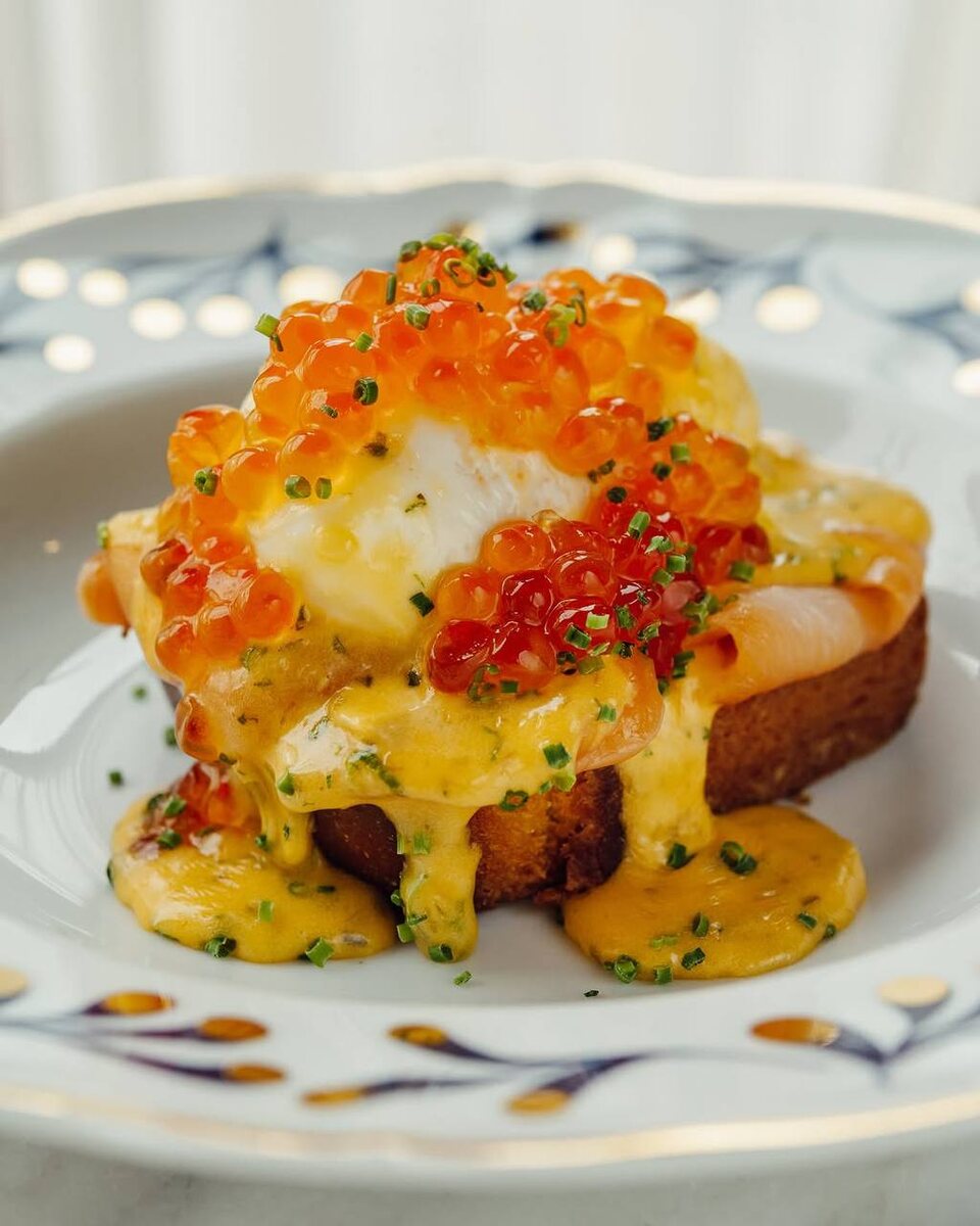 Роскошная вариация Бенедикта на бриоши – с лососем и икрой – искать в Mina.