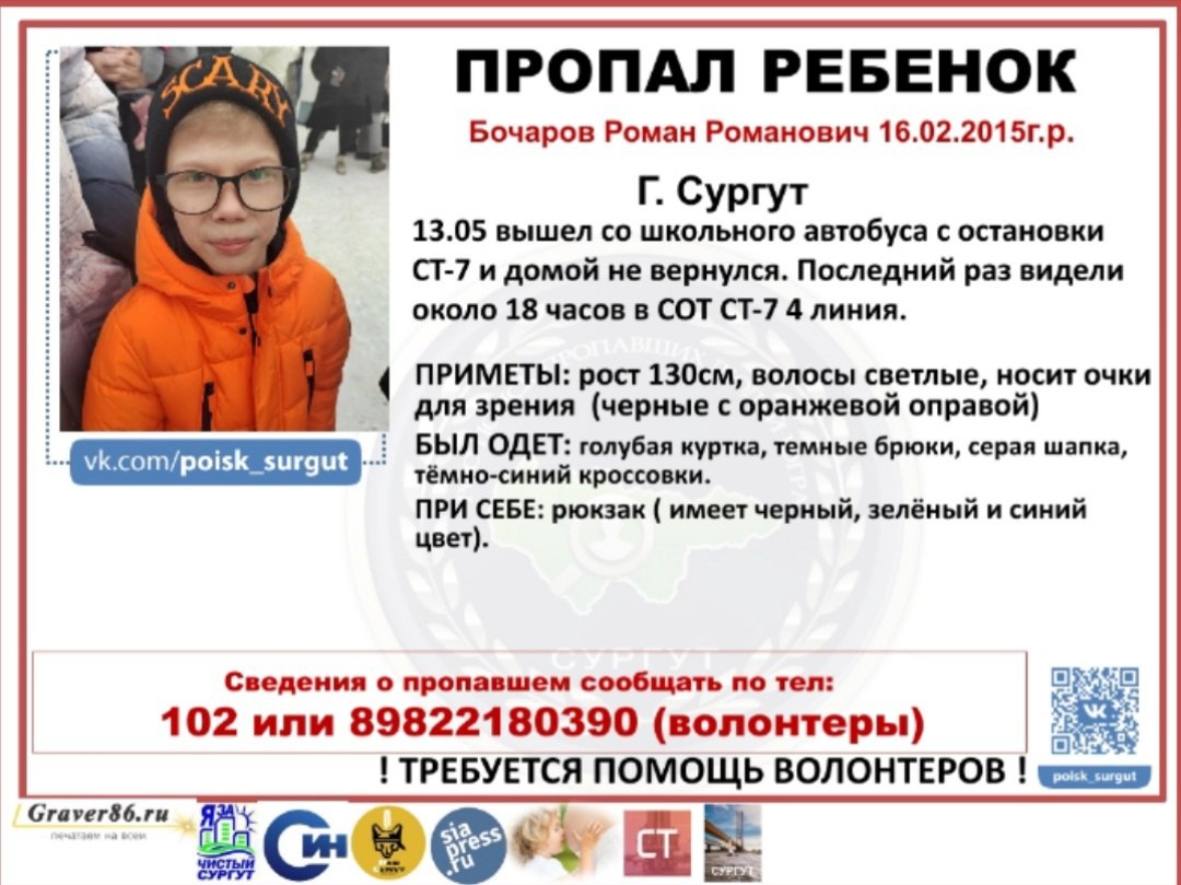 ‼️10-летнего мальчика разыскивают в Сургуте Роман Бочаров 13 мая вышел из школьного автобуса на остановке СТ-7, но домой так и не пришел. Последний раз его видели в 18:00 в СОТ СТ-7 4-я линия. 📸 vk.com / Поиск пропавших людей - Югра Подписаться | Прислать новость | Дать «буст»