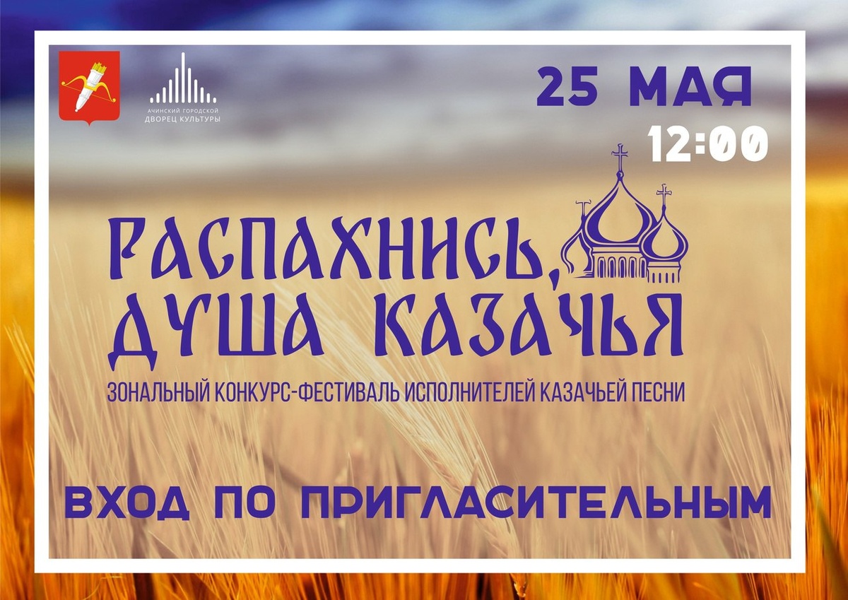 В Ачинске состоится зональный конкурс-фестиваль исполнителей казачьей песни🎶 В этом году уже в третий раз в Ачинск съедутся творческие коллективы и солисты со всего западного региона Красноярского края, чтобы принять участие в Зональном конкурсе-фестивале исполнителей казачьей песни «Распахнись, душа казачья!». 25 мая в 12.00 ачинцев приглашают в ГорДК стать зрителями этого яркого события. ВХОД ПО ПРИГЛАСИТЕЛЬНЫМ! Пригласительный можно получить на вахте ГорДК.