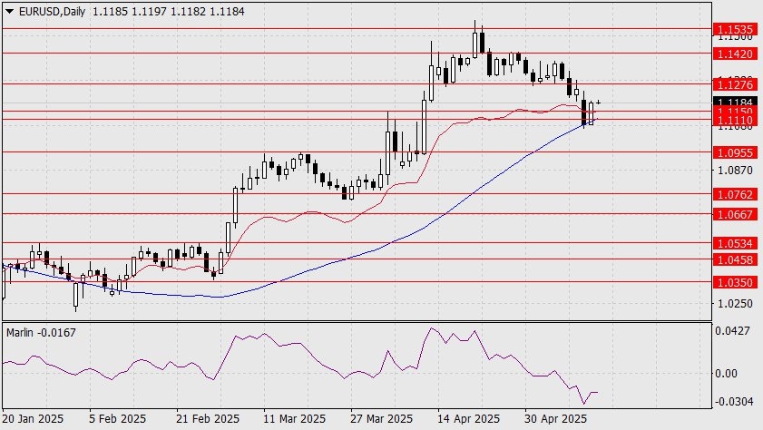 https://basechop.ru/wordpress/?p=42537 Во вторник евро не стал продолжать борьбу против рынка и подключился к рисковым тенденциям. Американский фондовый индекс S&P500 вчера подрос на 0,72%, индекс доллара снизился на 0,76%, евро подрос на 0,88% (99 пунктов). Помогли евро в этом и хорошие данные по экономическим настроениям ZEW, показавшие майский рост с -18,5 до 11,6. На графике дневного масштаба цена оттолкнулась от линии Крузенштерна, вышла над диапазон 1.1110/50 и приближается к целевому уровню 1.1276. Преодоление сопротивления открывает дорогу к цели 1.1420. Осциллятор Марлин развернулся в рост. На четырёхчасовом графике осциллятор Марлин вышел в зону растущей тенденции. Цена приближается к линии Крузенштерна. Закрепление цены над ней (1.1214) открывает возможность для атаки на сопротивление 1.1276 (вершина июля 2023 года). Развитие альтернативного сценария маловероятно – для этого цена должна закрепиться под линией Крузенштерна дневного масштаба, ниже уровня 1.1100. Материал…