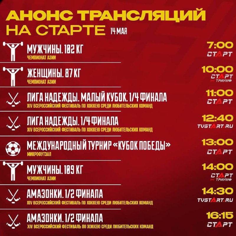 🙃 А у нас куча крутых трансляций! А у вас? Целый день смотрите спорт вместе с нами. Начинаем день с Чемпионата Азии по тяжелой атлетике, а продолжаем хоккеем и даже микрофутзалом. Вечером вас ждет предматчемая студия и сама игра полуфинальной серии Единой Лиги ВТБ между УНИКСом и ЦСКА. Также, возможно, уже сегодня определится чемпион Нидерландов. Для этого нужна победа «Аякса» и поражение ПСВ. Ждете? 👀 🛒 Наше приложение в Google Play 💙 Наше приложение в RuStore 🛒 Наше приложение в App Store