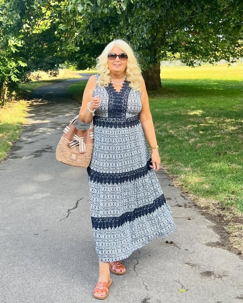 Животик — ну да, знакомая история для многих женщин после 50. С возрастом тело меняется: гормоны шалят, кожа теряет тонус, и всё это в первую очередь видно в районе талии. А мода, как назло, по-прежнему показывает только молодые, плоские животы и как будто вообще не замечает нас. То предлагают спрятаться в бесформенных мешках, то наоборот — втиснуться в какие-то «идеальные» стандарты, которые давно уже не про реальную жизнь. А правда-то где-то посередине: одежда должна помогать, а не мешать. Она не обязана всё подчёркивать — пусть лучше покажет лучшее и аккуратно прикроет то, что хочется спрятать. Особенно если у вас фигура типа «яблоко» — когда весь объём вверху, а талии почти нет. Тут важно увести взгляд от животика и сделать силуэт более мягким, женственным. И вот тут платья — просто спасение. Сегодня я собрала для вас 7 платьев, которые помогают фигуре — не просто прикрывают, а действительно стройнят и придают уверенности. Обратите внимание на это сине-белое платье с узором и вста