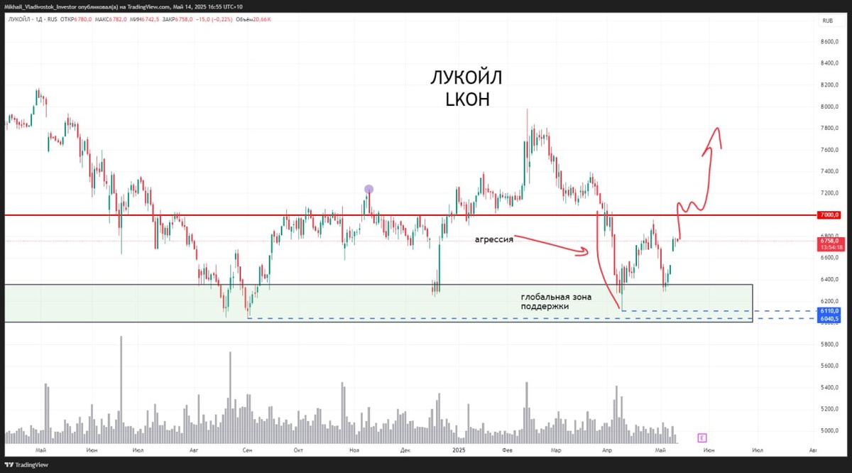 Оттолкнулся от поддержки. В левой части графика есть агрессивные продажи + приближаемся к сопротивлению 7000. Исходя из соотношения риск/прибыль, я бы покупки сейчас не рассматривал на данной акции. Только после выхода выше 7000 и закреплении.