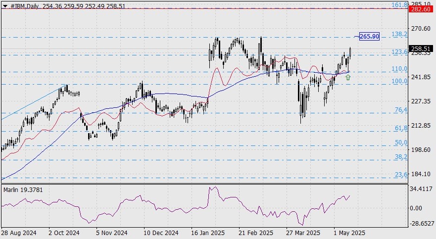 https://basechop.ru/wordpress/?p=42557 Покупка акций компании (#IBM) International Business Machines (IBM) – крупнейшая американская IT-компания, занимающаяся производством аппаратного обеспечения, разработкой программ и пр. На графике дневного масштаба цена в понедельник с силой оттолкнулась от точки пересечения линии Крузенштерна с уровнем реакции Фибоначчи 110,0%. Тут же находилась и линия баланса. Вчерашняя белая свеча произвела закрепление цена над уровнем Фибоначчи 123,6%. Осциллятор Марлин усиленно растёт. Ближайшая цель роста цены 265.90 – уровень реакции 138,2%, совпадающий с вершинами февраля и марта. Преодоление уровня открывает цель по следующему уровню Фибоначчи 161,8% на цене 282.60. Покупку акций компании IBM хеджируем продажей Johnson & Johnson (#JNJ). На графике недельного масштаба цена закрепилась под линиями баланса и Крузенштерна. Осциллятор Марлин снижается на территории нисходящей тенденции. Первая цель движения представлена минимумом января – 141.24, вторая це