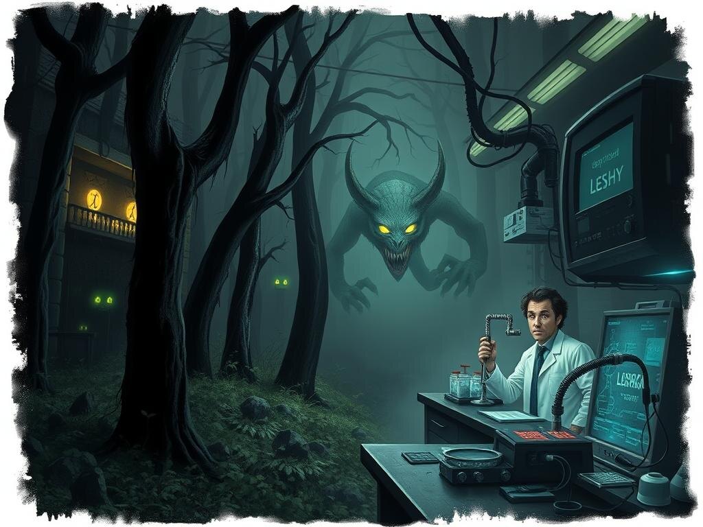 - Леший: Хозяин леса и квантовый хаос - Леший, дух-хранитель леса, способный менять свой облик и управлять стихиями, представляет собой, по мнению профессора Зеркалова, квантовый лес – сложную структуру из частиц тёмной материи, взаимодействующих друг с другом и с обычной материей. Он изменчив, непредсказуем и связан с хаосом и нелинейностью вселенной.