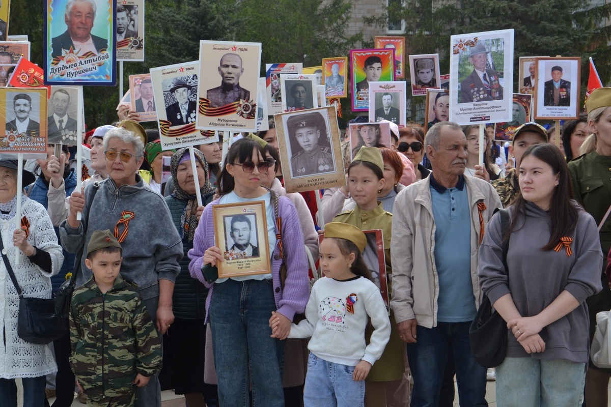 Празднование Дня Победы в Баймаке началось с шествия «Бессмертного полка» — впервые после перерыва в несколько лет. От кинотеатра «Ирандык» до городской площади жители и гости города прошлись с портретами родственников-фронтовиков.
