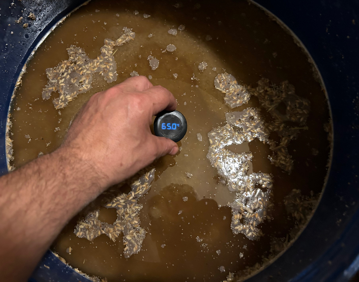 Подготовка оборудования и ингредиентов Оборудование: - Перегонный куб 50 л (ТЭН 3 кВт + индукционная плита 3.5 кВт, ограничение мощности до 3 кВт). - Пластиковый бак 170 л для осахаривания. - Пластиковый бак 63 л для промывки остаточных сахаров из дробины. - Пластиковый бак 120 л для охлаждения и сбраживания затора. - Насос из нержавейки с гофротрубой 3/4″. - Миксер с нержавеющим венчиком. - Чиллер для охлаждения. - Термометр для точного контроля температуры. - ph-метр, мерные емкости. Ингредиенты: - Дробленый ржаной солод: 15 кг. - Дробленый ячменный солод: 5 кг. - Ферментированный ржаной солод (для вкуса): 3 кг. - Рисовая лузга: 1.5–2 кг (8–10% от массы солода). - Бета-глюканаза: 4–6 мл (0.2–0.3 мл/кг солода). - Молочная кислота пищевая: ~ 4–6 мл (для корректировки pH затора). - Подготовленная вода pH ~ 5.5 (проверить перед затриранием, при необходимости подкислить). Этап 1. Нагрев первой порции воды ~25–35 минут. -
