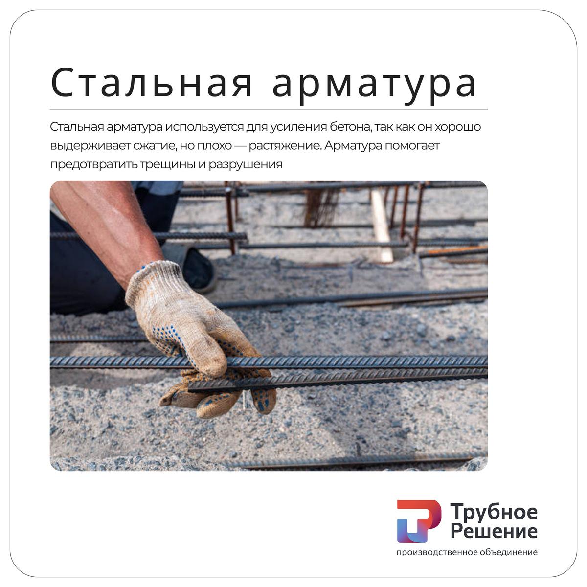 Стальная арматура используется для усиления бетона, так как он хорошо выдерживает сжатие, но плохо — растяжение. Арматура помогает предотвратить трещины и разрушения.