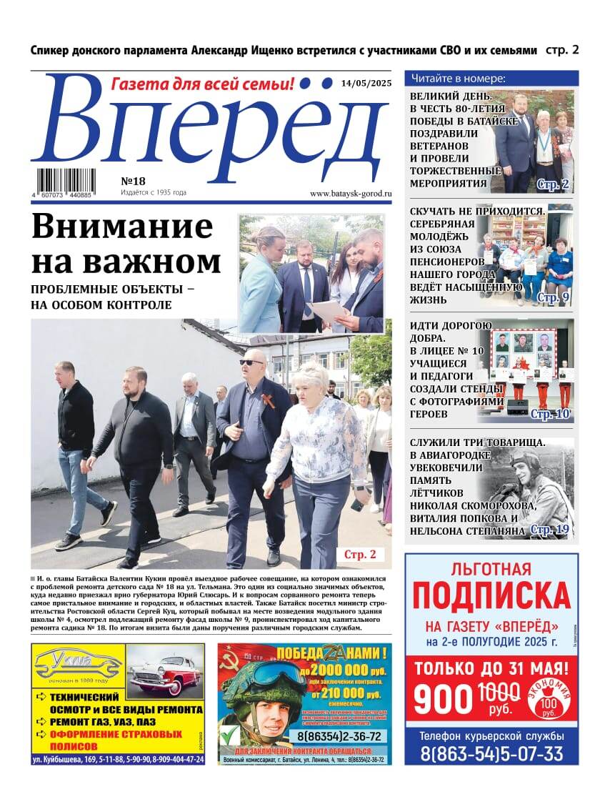 Стр. 2 Спикер донского парламента Александр Ищенко встретился с участниками СВО и их семьями Стр. 2 Великий день. В честь 80-ти летия Победы в Батайске поздравили ветеранов и провели торжественное мероприятие Стр. 2 Внимание на важном. Проблемные объекты — на особом контроле Стр. 9 Скучать не приходится. Серебряная молодежь из Союза пенсионеров нашего города ведет насыщенную жизнь Стр. 10 Идти дорогою добра. В лицее №10 учащиеся и педагоги создали стенды с фотографиями Героев Стр. 19 Служили три товарища. В сквере Авиаторов увековечили память летчиков Николая Скоморохова, Виталия Попкова, Нельсона Степаняна