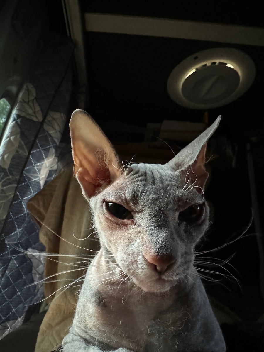 Каждое утро у нас начинается по одному и тому же сценарию. С рассветом Плюша (наша кошка-сфинкс) просыпается раньше всех и приходит ко мне. Она не орёт сразу — действует мягко. Мурлычет, трётся, аккуратно лапой приподнимает одеяло, чтобы напомнить: «время завтракать». Если не реагирую — лезет под одеяло и устраивает личный подъем. Я встаю. Кормлю. Но не всю порцию — опытный человек знает, что будет “второй заход”. Через десять минут — повтор. И вроде бы всё: миска пуста, кошка довольна. Но проходит немного времени — и начинается вторая волна. Плюша залезает на спинку водительского кресла, садится, смотрит на меня с укором и мяукает. Громко. Убедительно. С таким выражением, будто её не кормили с прошлого года. Что интересно — она стройная, небольшая, но аппетит как у тигра. А мы ведь живём в автодоме. Путешествуем уже больше полутора лет. И в каждом месте — свои ритуалы, но утренний «пищевой саботаж» стабилен. Если вы думаете, что жизнь в доме на колёсах — это бесконечная романтик