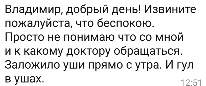 Часто ко мне обращаются друзья, знакомые и пациенты, которые когда-то лечились у меня, по разным вопросам по здоровью. Выше – такой пример. Ситуация жизненная. Ситуация распространённая. Давайте разберём возможные варианты. 1. Первое, что может быть, - это серная пробка. То есть серные массы полностью перекрыли просвет наружного слухового прохода, и произошло это внезапно. Но пробка в ухе не возникает из ниоткуда. Должна быть предпосылка. Например, мытьё головы перед сном. Вечером вы помыли голову, вода попала в слуховой проход, сера размякла и сформировалась пробка. 2. Второй вариант может быть связан с носоглоткой и слизью в носу. Если вы лежали на боку, патогенная слизь из носовой полости или околоносовых пазух, пока вы спали, могла попасть в слуховую (евстахиеву) трубу. Как результат – воспаление и чувство заложенности. 3. Проблема может быть связана не с лор-органами, а с общим состоянием человека. Спровоцировать гул и заложенность в ушах могут, например, повышенное внутричер