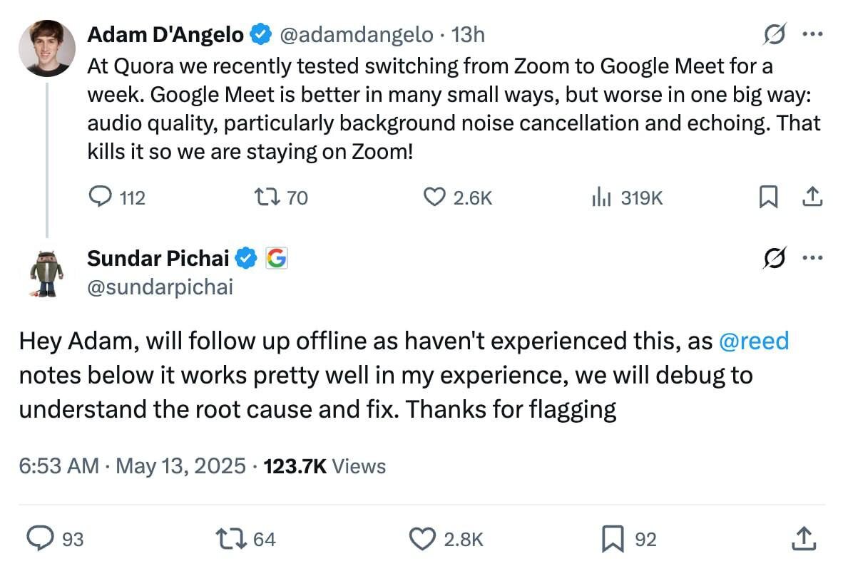 Генеральный директор Google, Сундар Пичай, сам отвечает на жалобы пользователей в соцсетях. Один из разработчиков высказал недовольство по поводу качества звука в Google Meet, и Пичай оперативно отреагировал на его сообщение.