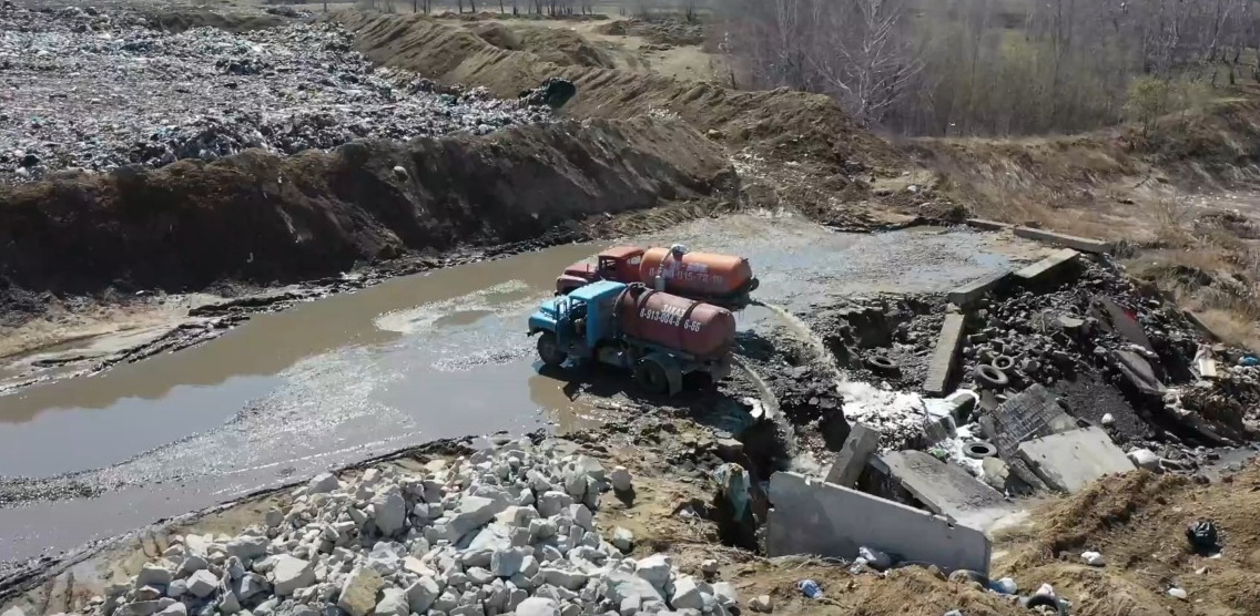 На кадрах можно увидеть, как две машины остановились рядом с мусорным полигоном и начали сбрасывать содержимое цистерн в водоем. Теперь общественники обеспокоены тем, что что отходы из-за распространяться в те места, где купаются люди, и создаст опасность для их здоровья.