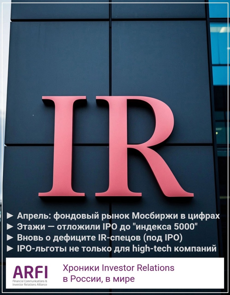 Утренний IR-дайджест 14.05.2025 ► Фондовый рынок Мосбиржи в апреле: • 2 924,79 (-2,9% за апрель) — Индекс МосБиржи • 36,7 млн (+1,21% м/м) — число россиян с брокерскими счетами на MOEX • 3,6 млн (-10% м/м) — число активных инвесторов • 74,7% — доля физлиц в объеме торгов акциями и паями (31,5% — облигациями) • Перетоки между сегментами рынка: +₽168,4 млрд — приток в корп. облигации +₽23,8 млрд — приток в акции -₽10,6 млрд — отток из паёв БПИФов ► Чистый приток средств в розничные ПИФы в апреле составил рекордные с начала года ₽40+ млрд (Коммерсант) • ₽25+ млрд — чистый приток в облигационные фонды • ₽16 млрд — чистый приток в фонды денежного рынка (на треть больше марта) • Фонды акций — пока аутсайдеры у инвесторов ► Этажи — риелторская компания отложила процесс размещения своих акций на фондовом рынке, хотя ранее планировала сделать это до 2027 года. Причиной решения стал риск их низкой оценки ввиду индекса Мосбиржи, который на данный момент держится в районе 2800 пунктов. Глава ко