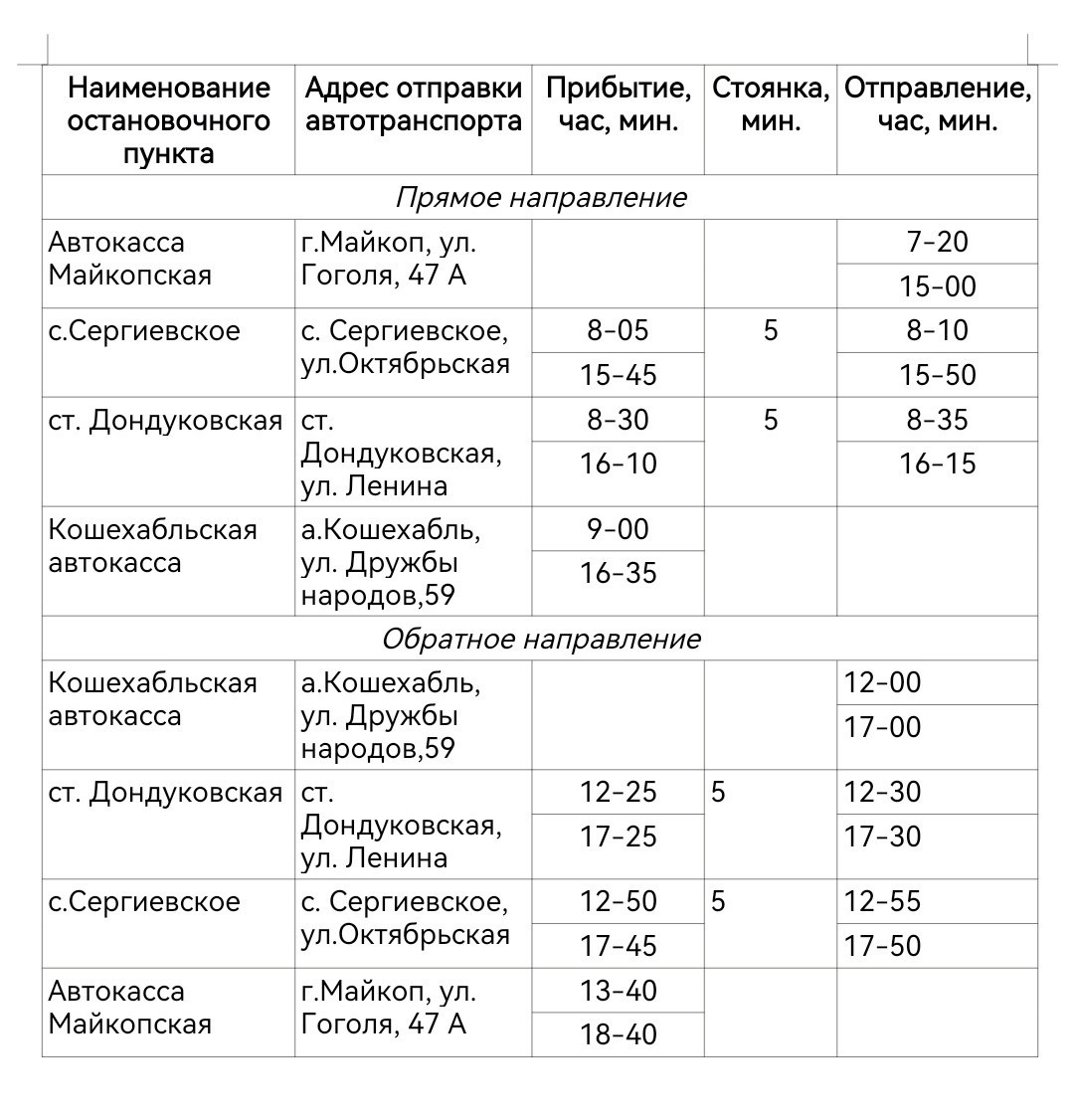 Автобус следует через с. Сергиевское, ст. Дондуковскую до а. Кошехабль с заездом в Кошехабльскую центральную районную больницу.